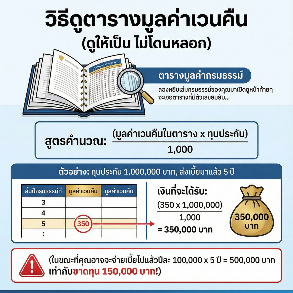 วิธีคำนวณ: สูตรคือ: (มูลค่าเวนคืนในตาราง x ทุนประกัน) / 1,000